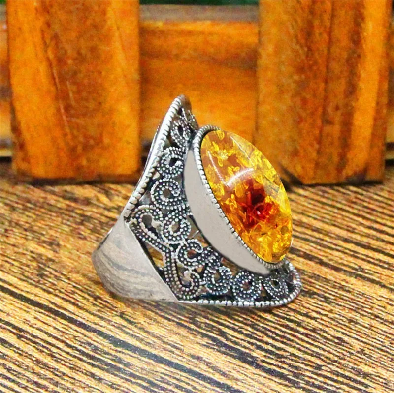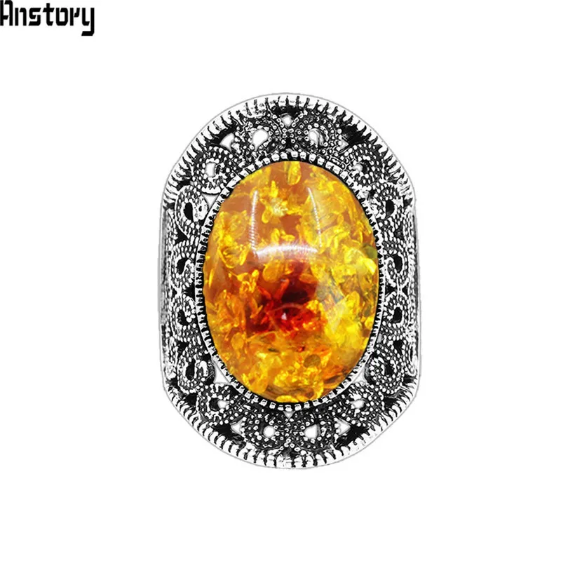 Best Oval Resin Simulated Ambers Rings For Women Flower Plant Antique Silver Plated Rings Fashion Jewelr