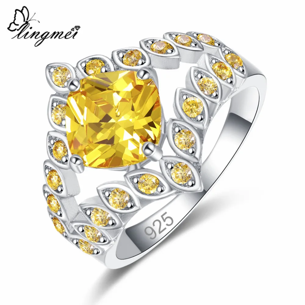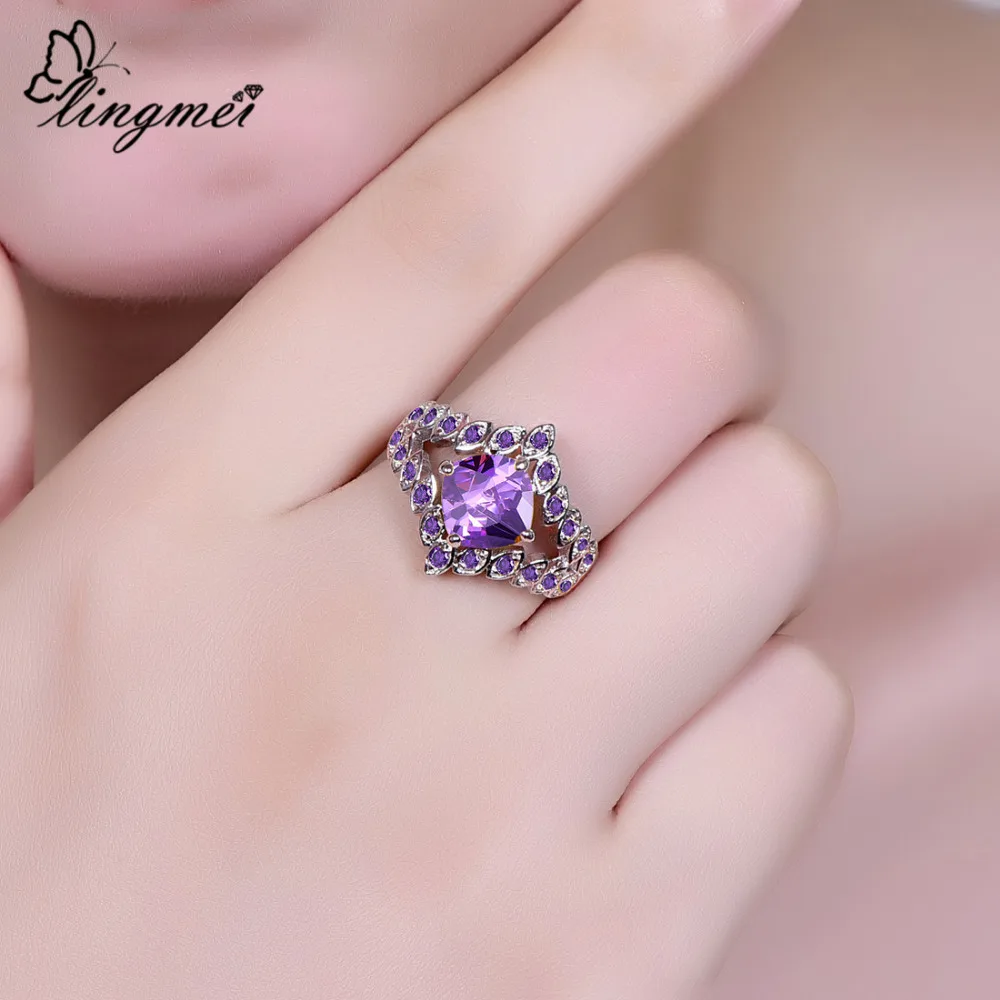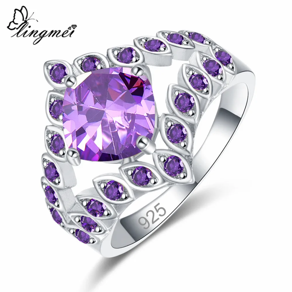 New Lingmei Gorgeous Cocktail Party Round Marquise Jewelry Purple & Gold Zircon Silver Ring Size 6 7 8